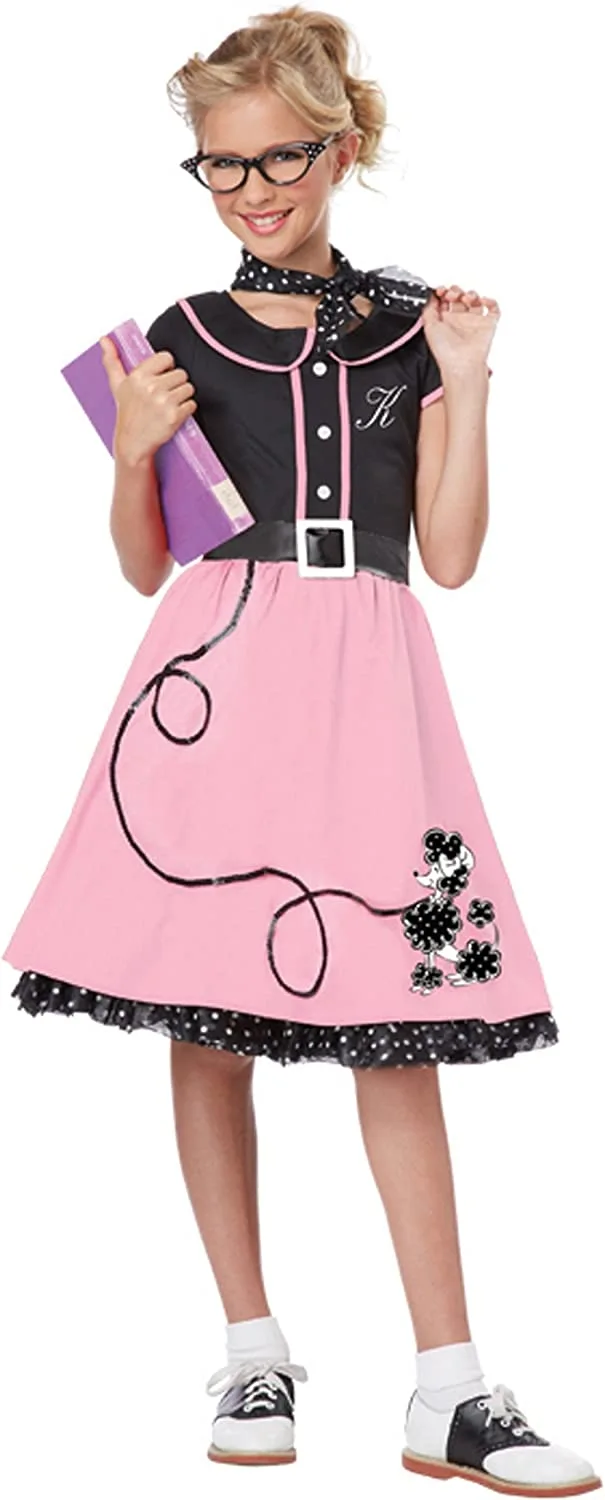 Rock and roll your way back to the 1950s this Halloween when you wear the Girl’s 50s Sweetheart costume! The outfit includes an A-line dress designed to look like a separate shirt and skirt set. The top is black and features pink bands around the sleeves, near the neckline, and down the front of the dress on either side of the column of three white buttons.