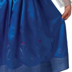- Dress with velour bodice and satin middle panel. Satin panel with glitter print motif and ‘v’ cut out with gold trim. Character printed motif on satin ‘V’