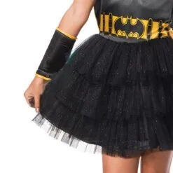 - Dress with digitally printed satin bodice showing bat emblem on chest and belt details at waist, plus ruffle tutu skirt with nylon underlay and three layers of glitter tulle ruffles