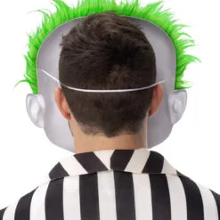 - Injection Moulded Plastic Mask of Beetlejuice’s face with attached long pile green faux fur hair