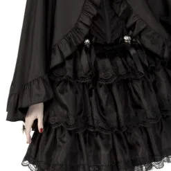 - Cape has scalloped edge and frilled trim and a feature high collar