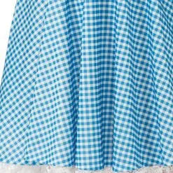 - Gingham printed polyester skirt with lace trim at hem.