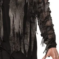 - Hooded shirt with heavy fabric pieces attached and rips and tears throughout