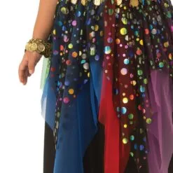 - Satin long skirt with colourful tulle panels hanging from waist and tulle overlay with metallic polka dot print plus gold coin embellishments hanging from waist