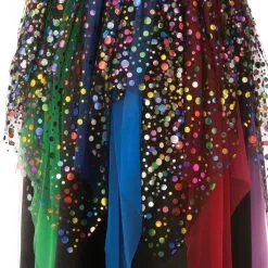 - Satin long skirt with colourful tulle panels hanging from waist and tulle overlay with metallic polka dot print plus gold coin embellishments hanging from waist