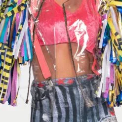 - Jacket made from a clear vinyl with fringe sleeves and faux zipper trim