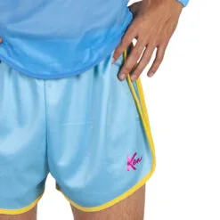 - Electric blue sports shorts with yellow trim and metallic pink Ken Logo