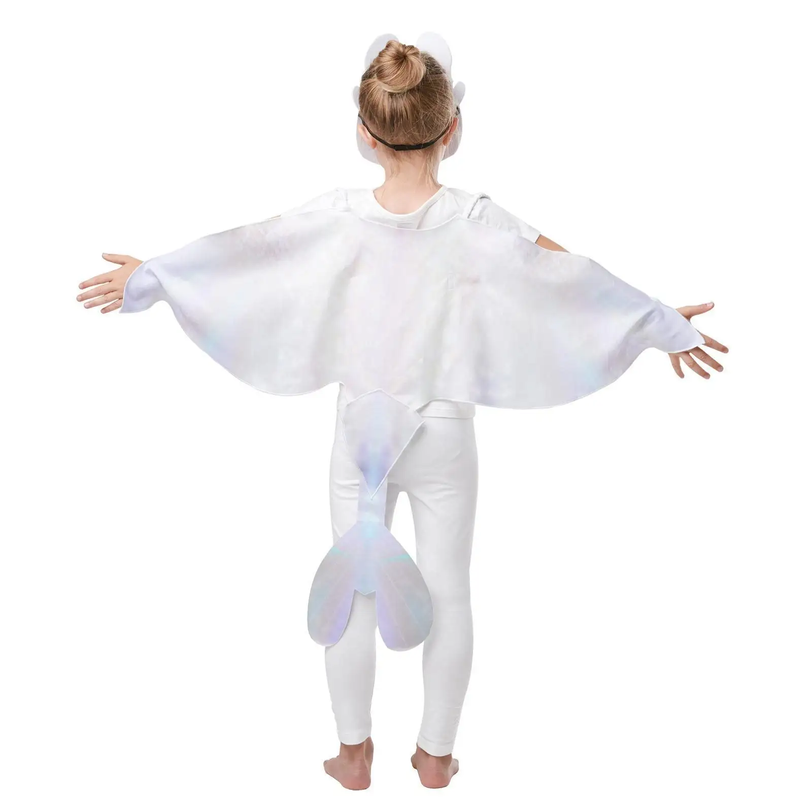 - Wide span, sheer white cape wings with scalloped edging, straps at shoulder and wrists and attached felt tail