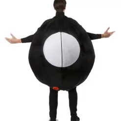 - Round plastic bodysuit with printed exterior, zip up back, and toggled, elastic openings for arms and legs to stop air escaping