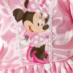 - Iconic Minnie Mouse dress made from satin material featuring trademark white spots on skirt and puffy sleeves. Centre of bodice features digitally printed Minnie Mouse print on satin material and stitched in panel with embroidered trim