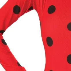 - One piece jumpsuit in bright red with printed black dots on front and back and on arms and legs