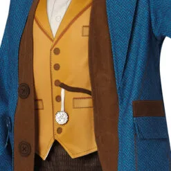 - Long style waistcoat with large lapels, faux pockets and a blue button