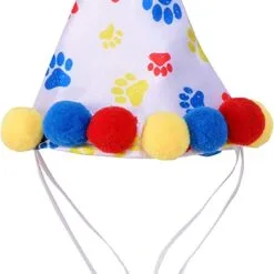 - Soft satin pointed hat with red, yellow and blue paw prints all over it