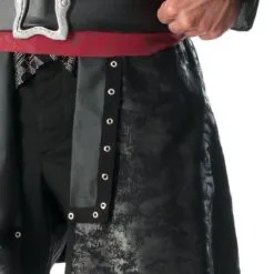 - Long suede-look jacket with digitally printed skulls and built in vest with wide lapels and gathered pirate-style sleeves