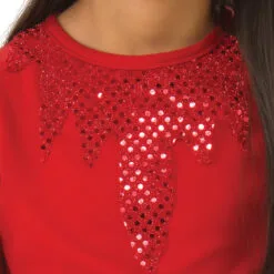 - Red dress with long, jaggered edge sleeves and sequin design at the collar
