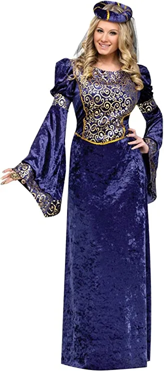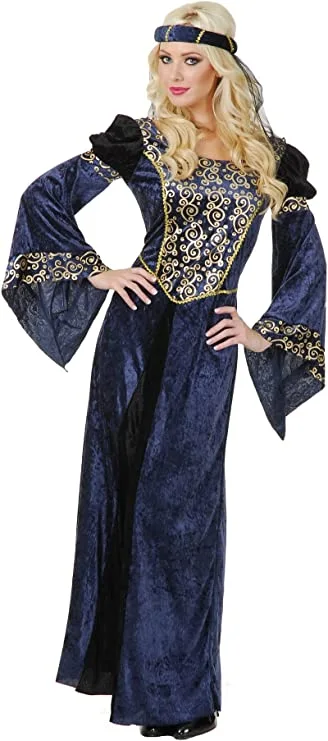 Here is an outfit straight from medieval times that brings back the romance and elegance of that era. This Ladies Navy/Black Renaissance Costume for adult ladies is medieval fashion at its very best. This sexy and elegant Renaissance costume for ladies is perfect for LARP events, Halloween, Renaissance fairs and dress-up parties.