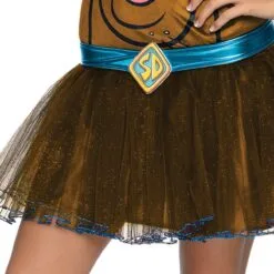 - Skirt of tutu dress is triple layered glittery tulle with blue stitching at hem plus waist band in satin metallic fabric with iconic Scooby Doo logo as collar