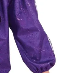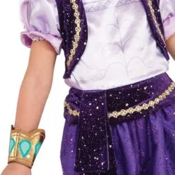 - Genie-styled jumpsuit with glittery pants and elastic at ankles, plus attached torso and mock vest with printed detail and capped sleeves. Jumpsuit features attached belt with gold edging and side tie