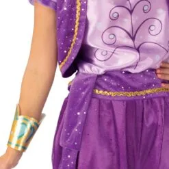 - Genie-styled jumpsuit with glittery pants and elastic at ankles, plus attached torso and mock vest with printed detail and capped sleeves. Jumpsuit features attached belt with gold edging and side tie