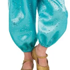 - Genie-styled jumpsuit with glittery pants and elastic at ankles, plus attached torso and mock vest with printed detail and capped sleeves. Jumpsuit features gold painted 3D shoulder pieces plus attached belt with gold edging