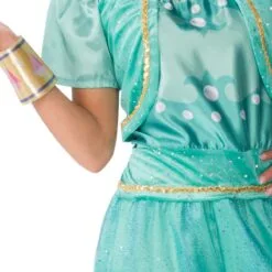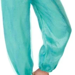 - Genie-styled jumpsuit with glittery pants and elastic at ankles, plus attached torso and mock vest with printed detail and capped sleeves. Jumpsuit features gold painted 3D shoulder pieces plus attached belt with gold edging