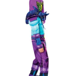 - Headpiece is an EVA mask of the iconic green Skeletor face with eyeholes cut out to see through and has a purple hood