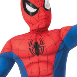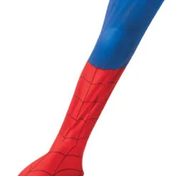- Black and red jumpsuit in deluxe wet look fabric with iconic Spider and web print on bodice and fibre filled muscle chest and abs