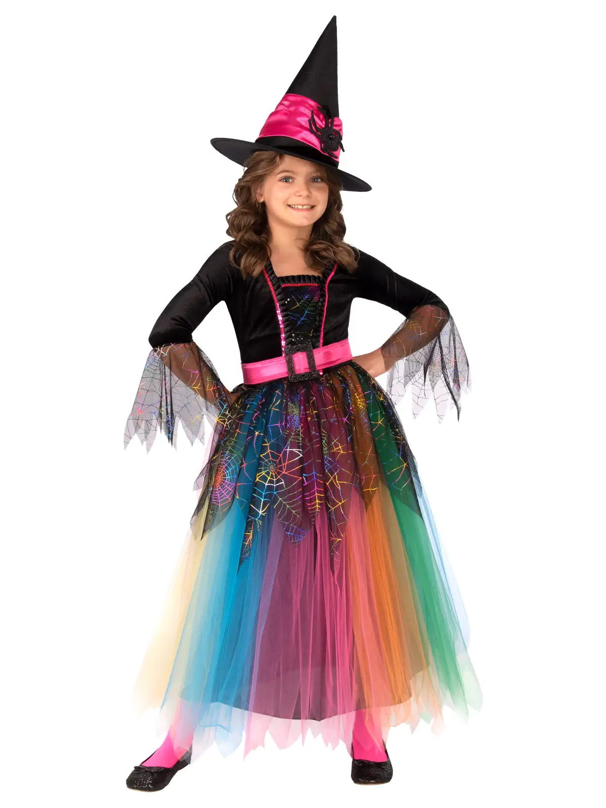 - Pointed witches hat with oversized brim, matching pink satin band and large spider prop attached at side