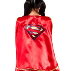 - Tutu dress with sequined bodice featuring gold trim and red gathered fabric at shoulders, and attached satin skirt with printed gold Supergirl emblems