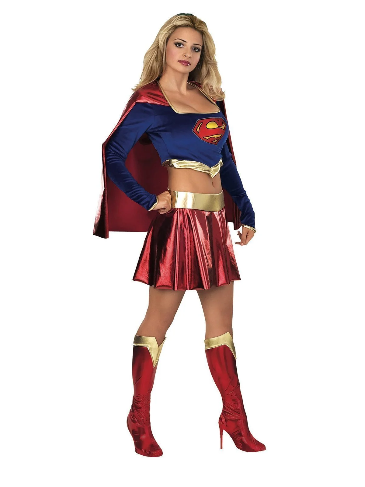 - Midriff top with scoop neckline with metallic trim, Supergirl emblem print on chest, metallic panel at waist and full length sleeves with metallic trim plus attached cape in metallic fabric
