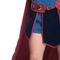 - Mini dress with printed armour detail on bodice, high neck in metallic fabric, attached cape and attached bandolier with metal buckle