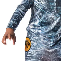 - Jumpsuit features a shiny, scale-like fabric plus attached dinosaur feet with faux claws to cover shoes