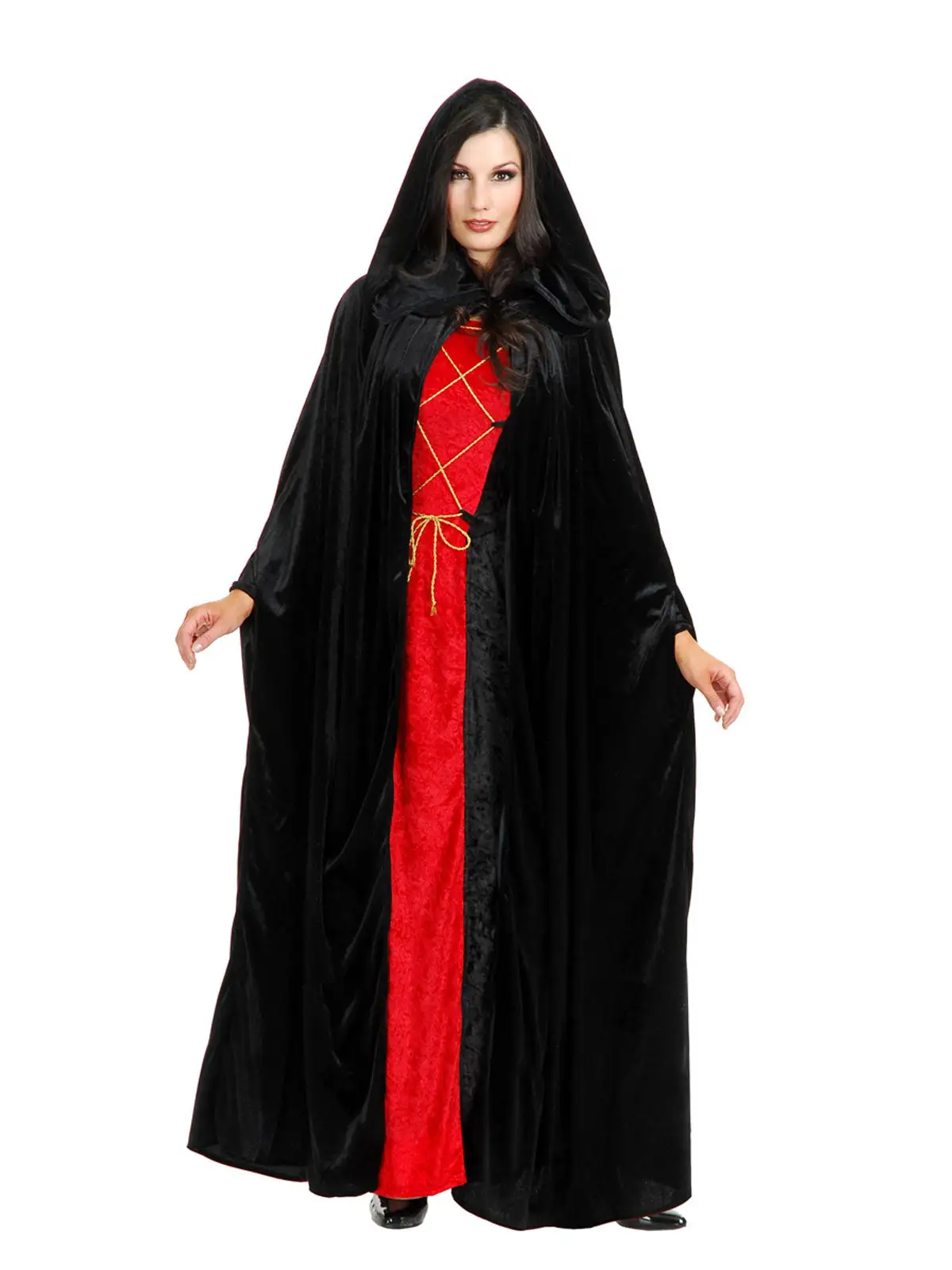- Cloak is made from black crushed velvet and has a clasp to join at collar