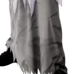 - Long digitally printed grey tunic with tattered tulle white robe overlay and tattered sleeves, plus attached grey hood