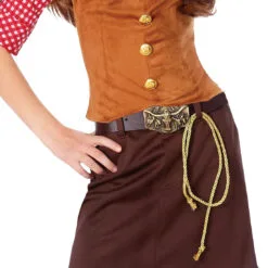 Re-live the days of the Wild West this Halloween when you go in our Gunslinger costume for girls! You’ll be fit to face even the most unruly of western bandits when you put on this great costume. It comes with a dark brown skirt with a brown belt that has a large metallic belt buckle with a bull’s head on it because what’s a cowgirl without the big belt buckle? The Gunslinger’s tan vest has metallic buttons