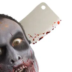 - Plastic blood splattered butcher cleaver on a hard plastic headband